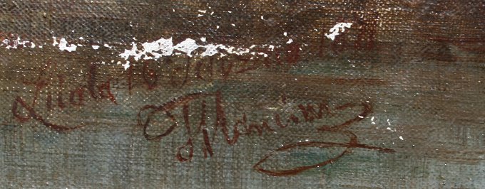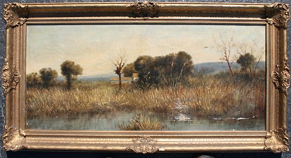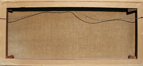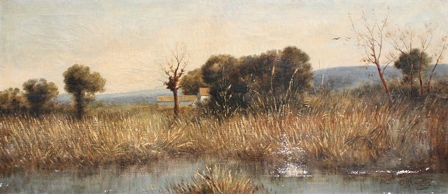 ILLEGIBLY SIGNED PANORAMIC RURAL LANDSCAPE: OIL/C, 15'' x 34'', illegibly signed Thevinaz?, gilded gesso frame, 21'' x 40''. Several scattered abrasions.