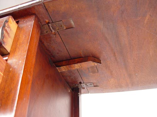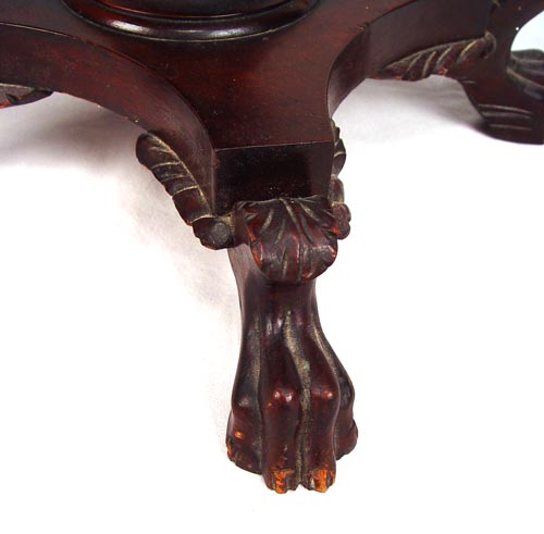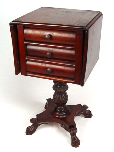 DARK MAHOGANY 3 DRAWER WORK STAND: Drop leaf stand with bowed drawers, carved pedestal base and claw feet. Measures 39'' high x 39 1/4'' wide open, 17'' wide closed x 16'' deep