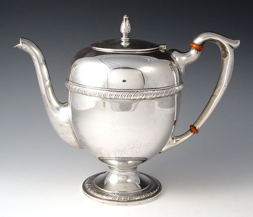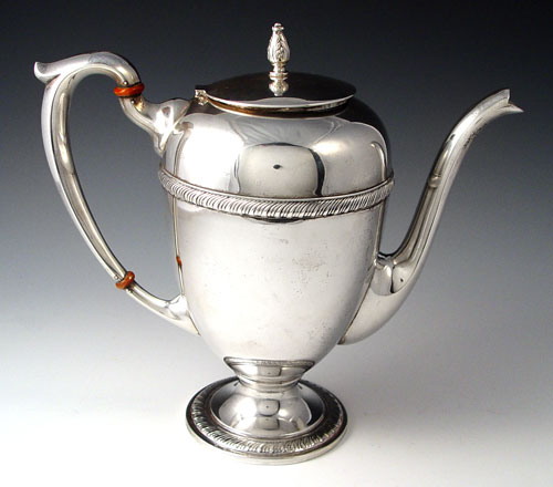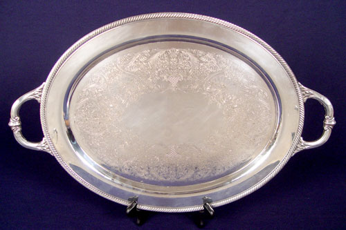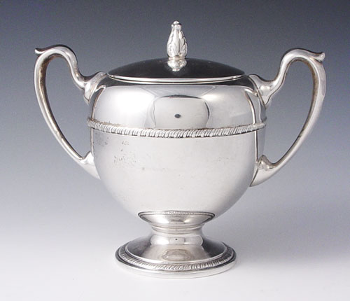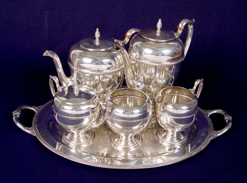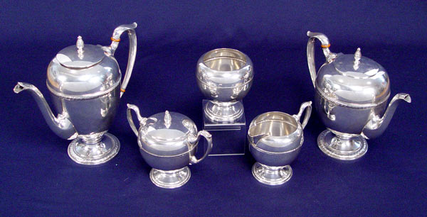 5 PIECE DUNKIRK STERLING TEA SET W/ SILVERPLATE TRAY: To include COFFEE POT, measures 9 7/8'' high. Note hinged lid does not close all the way, tiny dent. TEAPOT, measures 8 3/4'' high. Covered SUGAR, measures 5 3/4'' high, note tiny dent. Open CREAMER, measures 5 1/8'' high. WASTE BOWL, measures 4 1/2'' high, note tiny dent. Come with a International silverplate serving tray, note flaking of plate on handle. Approx 56.9 troy oz.