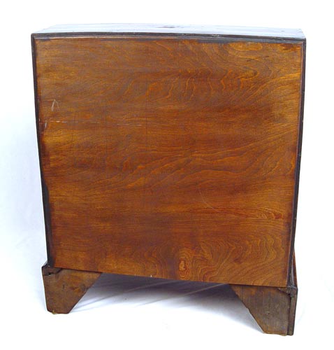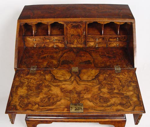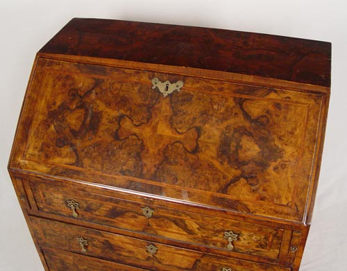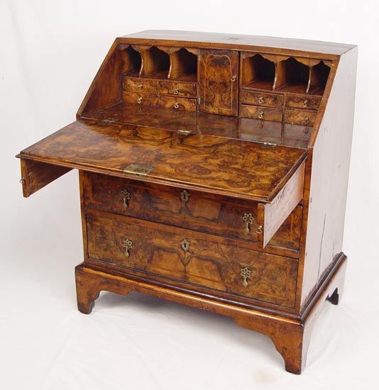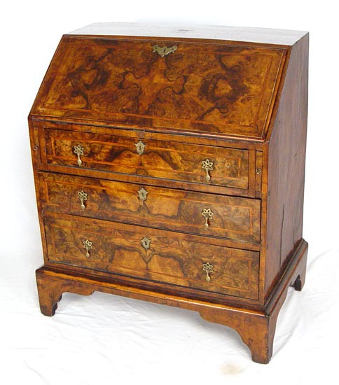 ENGLISH SLANT FRONT BUREAU DESK: Richly grained case with feather inlay. Bracket feet under three full length drawers. Interior desk fitted with drawers and pigeon holes. Measures 37 1/2'' high x 30 3/4'' wide x 19 1/2'' deep.