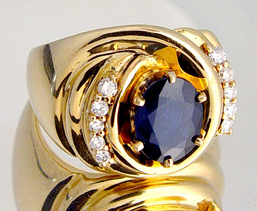 3 CT SAPPHIRE AND DIAMOND RING: Oval sapphire, approx. 3 ct in deep dark blue, set with 10 diamonds, approx. .25 ctw, white color, S1 clarity. 14K yellow gold, Size 7.75. Approx. 11.6 grams