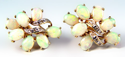 OPAL AND DIAMOND FRENCH SCREWBACK EARRINGS: 14 fiery cabochon opals, approx. 5.5ctw, set with 15 points of diamonds. Stamped 14K and illegible designers name.