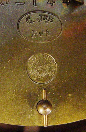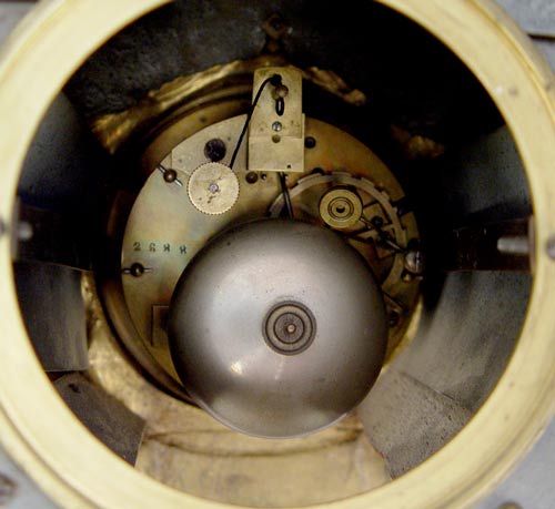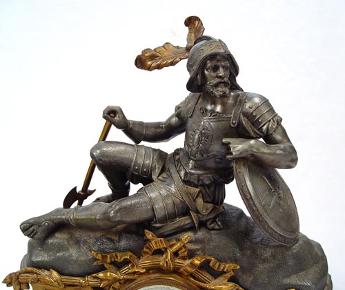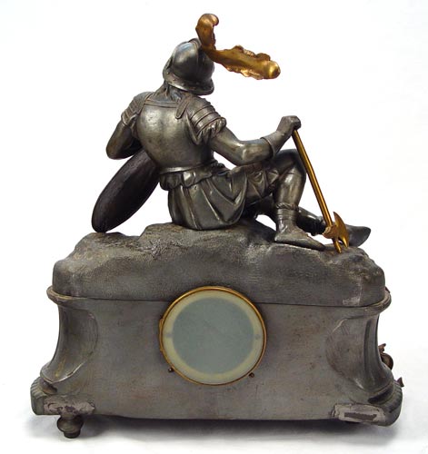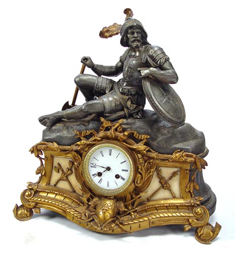 JAPY FRERES FRENCH SOLDIER FIGURAL CLOCK: Circa 1880's cast metal mantel clock in with soldier reclining on shield top. Ornate gold metal decoration on front, with slag glass panels. 3 1/2'' porcelain face with Roman numerals. Frosted glass back bezel. Marker on works Japy Freres with bronze medallion. Measures 18'' high x 16 1/2'' wide x 7'' deep. Please note back feet damage with old repairs, missing pendulum.