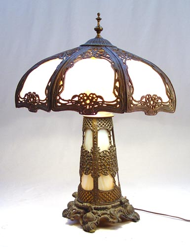 VINTAGE SLAG GLASS TABLE LAMP: 8 panel shade with metal filigree, double socket pull chains, illuminated base. Lamp is 26'' high, shade is 18 3/4'' dia. Replaced finial.