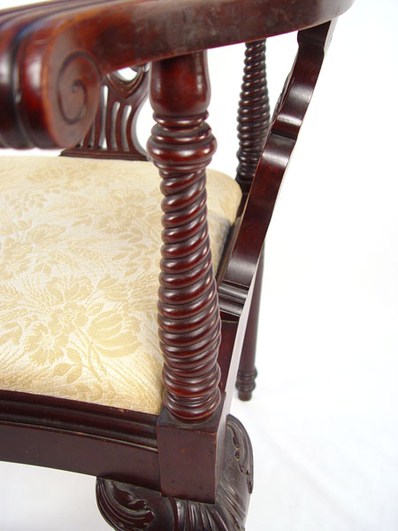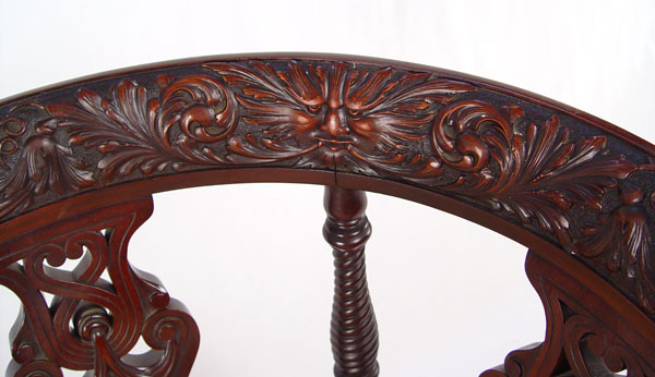 LATE 19TH CENTURY CARVED MAHOGANY CORNER CHAIR: North wind carved top rail, spiral arm supports, pierce carved splat. 31 1/4'' high x 28 1/2'' wide x 26'' deep