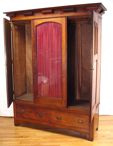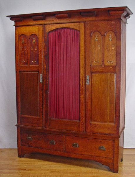 ARTS & CRAFTS / ART NOUVEAU BRASS INLAY ARMOIRE: Measures 81 1/2'' high x 65'' wide x 23'' deep