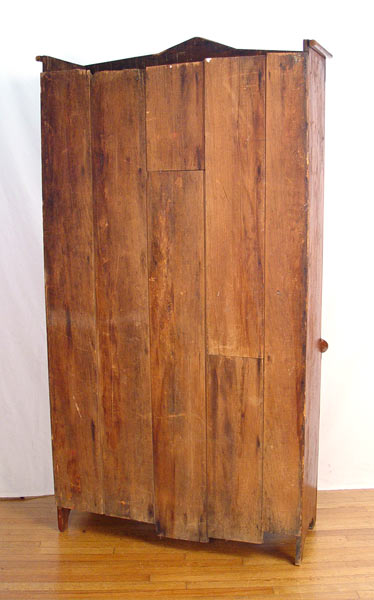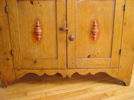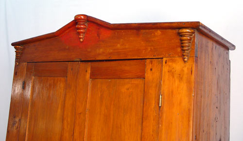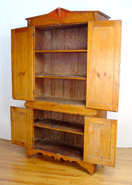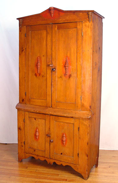 19th C. AMERICAN COUNTRY PINE CUPBOARD: Four door cupboard, applied turnings decorate the doors and top rail. Small remains of red paint. Sides are one board. 85'' high x 45 1/2'' wide x 18 1/2'' deep.