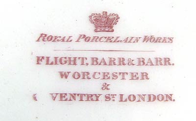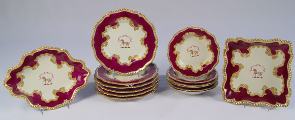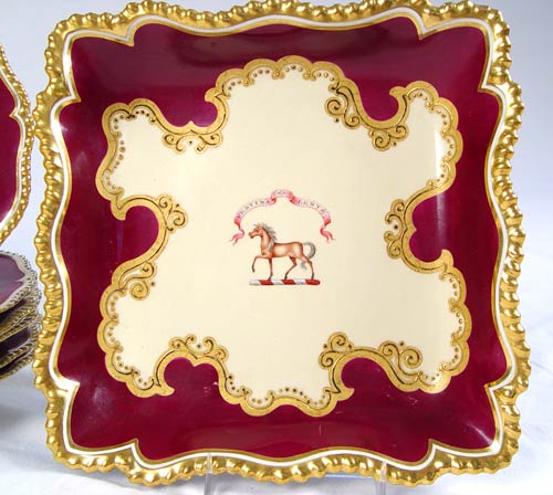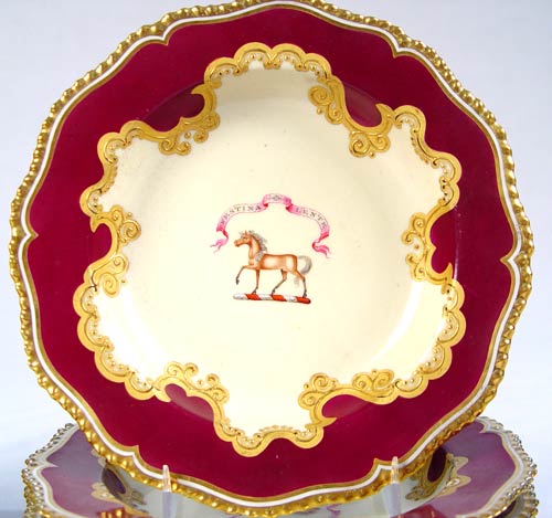 FLIGHT BARR & BARR WORCESTER SOFT PASTE DESSERT SET: 14 hand painted pieces, horse in the center below a ''Festina Lente'' banner (make haste slowly). The set includes 6 plates,9 3/4'' dia., 6 soup bowls, 7 3/4'' dia., an oblong serving plate,12''l, and a square serving plate, 9 1/4''. Circa 1783-1840