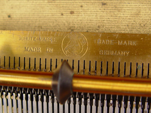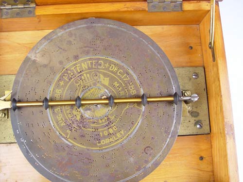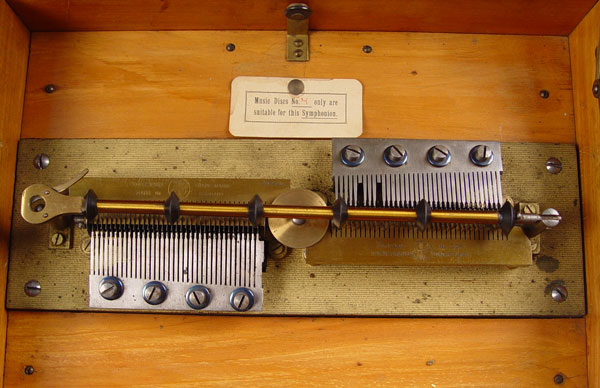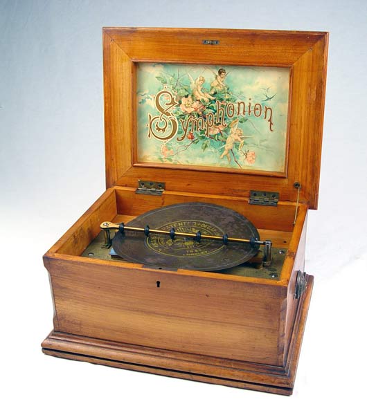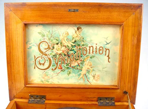 SYMPHONION 9.5'' MUSIC BOX WITH DISC: Table top walnut case 9.5'' disk Symphonion music box. Inner label with cherubs and Symphonion. Serial number 262649. Double comb mechanism, 2 missing teeth. Plays, please note crank appears to be a replacement. Comes with one disk #1080 Loreley. Case measures 8 1/2'' high x 16'' wide x 12 1/2'' deep.