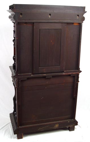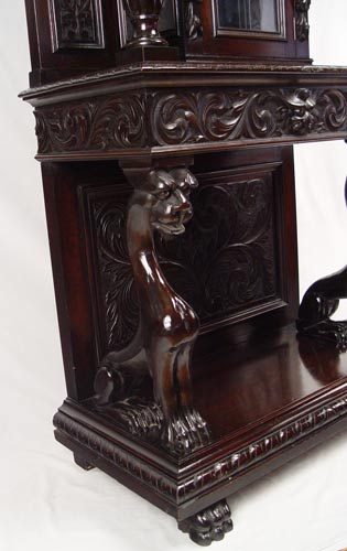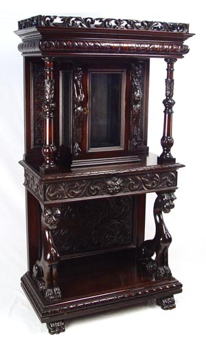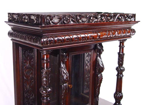 HEAVILY CARVED SIDE CABINET: Pierce carved crest with lion carved figural supports on the lower half, acanthus leaf supports on the upper. Single glass front door display. 68'' high x 36 3/4'' wide x 19'' deep. Later 19th C.