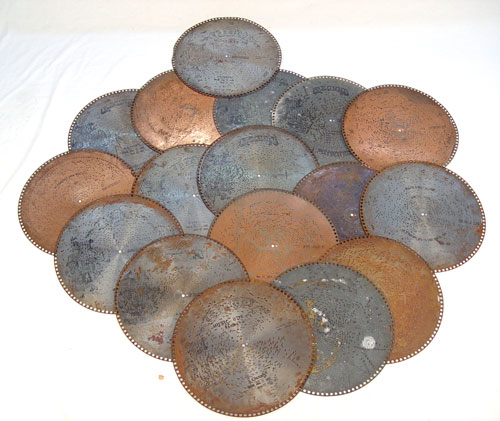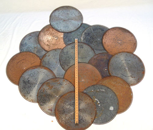 LOT OF 17 REGINA MUSIC BOX DISCS: 15 1/2'' disk to include 1) 1142 Bohemian Smetana. 2) 1911 I'm Tired Song Schwartz, note bend in edge. 3) 1872 Good Morning Carrie Song Smith & Bowman. 4) ?063 Polka, note condition. 5) 1163 Polish, Nikowioza. 6) 1362, cannot make out name. 7) Bad Joke Song Pether. 8) 1979 King Dodo Diana Song. 9) Della from Delaware Song 10352. 10)The Bird on Nellies Hat song 10708. 11) And the World Goes on Song Sutton 10417. 12) 1145 Polish A. Vogt. 13) 1671 Stars of the Sea, Reverie Kennedy. 14) My Syncopated Gypsy Maid Song Levi 10577. 15) 1241 The Harp That Once, Irish Melody. 16) 1086 Lohengrin Wedding Song Wagner. 17) 10745 Who Do You Love? Song. Please note some surface rust on many discs, several titles and numbers very faint.