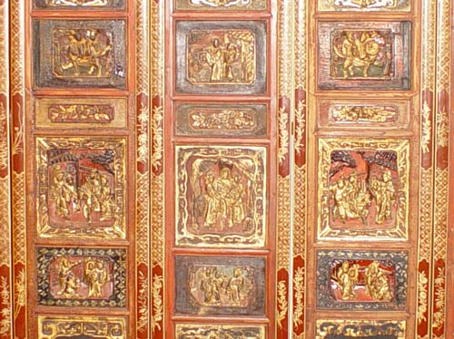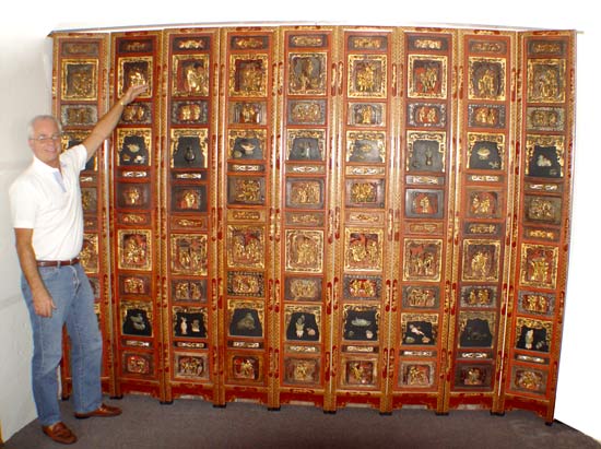 9 PANEL CARVED AND GILT WOOD CHINESE WALL PANELS: Rich in detail with iron red and gold painted and carved panels. Carved and recessed panels along with applied carved soapstone panels. Approx. 7'7''h x 10' wide.