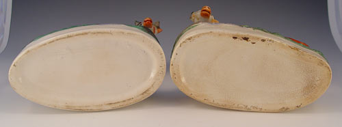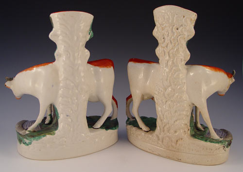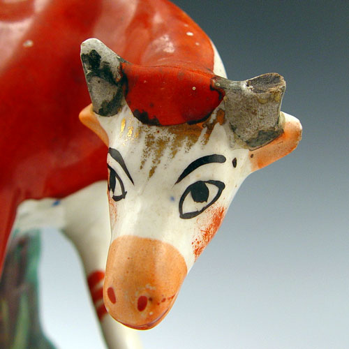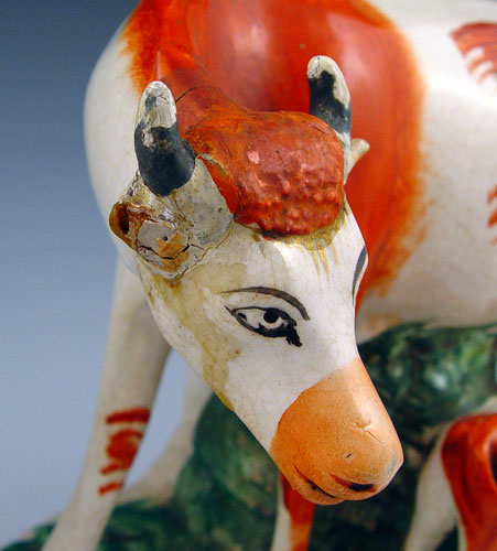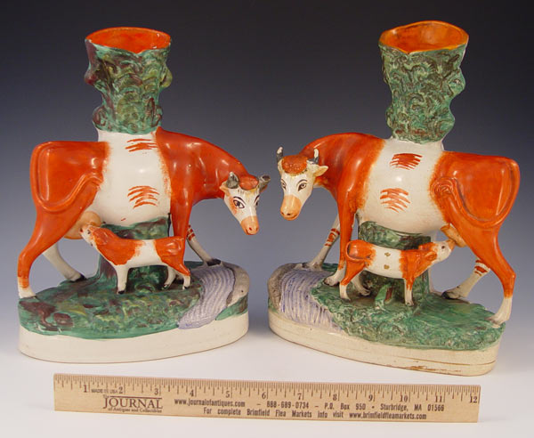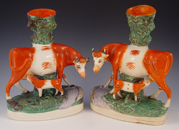 PAIR OF 19TH C STAFFORDSHIRE COW AND CALF SPILL VASES: Modeled as a cow and nursing calf by the stream. Right facing cow has loss of horn tip. Left facing cow has old restoration work around horns, with loss of one ear. 10 3/4''h. x 8 1/8'' dia.