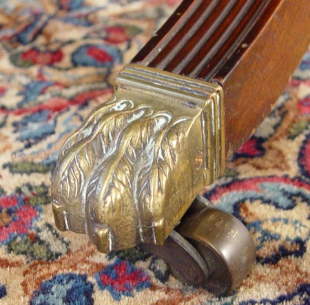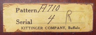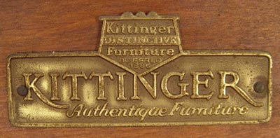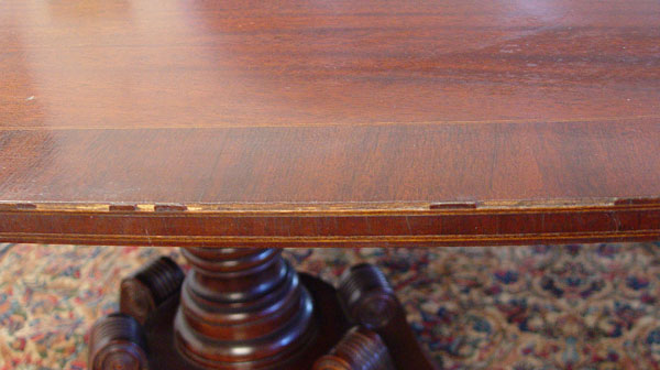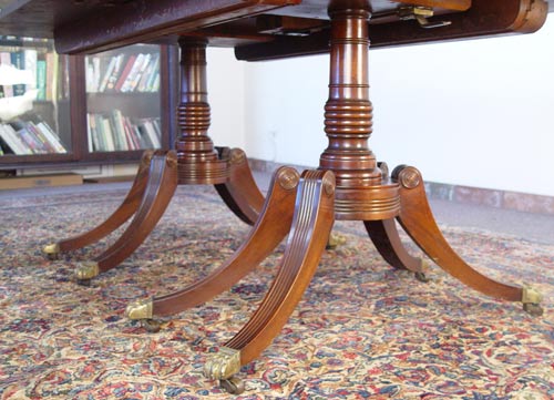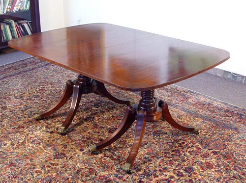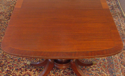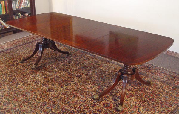 KITTINGER MAHOGANY DINING TABLE: Model A710. Banded mahogany, double pedestal dining table with 3 leaves. Brass label on the table, paper label on the leaves. 28 1/2''h. x 66'' long x 44'' wide. With the 12'' leaves in place the table extends to 102'' long.