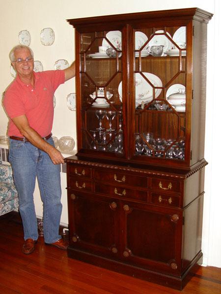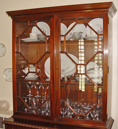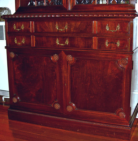 KITTINGER MAHOGANY CHINA CABINET: Brass Kittinger label. Featuring gadroon carving and rosettes. Lower section with 2 full length drawers over cabinet doors. Approx. 77''h. x 18 1/2'' deep x 41'' wide.