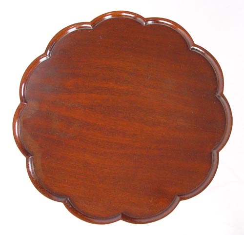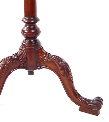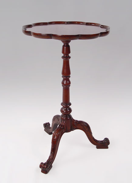 KITTINGER CANDLE TABLE: Mahogany table A355. Scallop edge, carved pedestal and legs. Note the finish condition on the top. 28 1/2''h. 17 1/2'' dia.