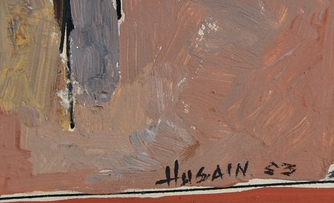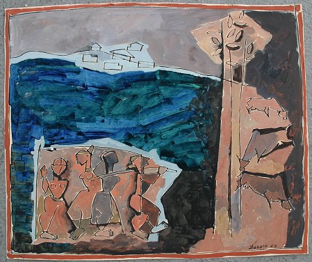 HUSAIN, Maqbool Fida, (India, 1915-): Landscape with Figures & Cows, W/C & Gouache, 11'' x 13 1/2'', signed Husain and dated '53, unframed. Several faint water spots in right margin, small repair to paper visible verso.