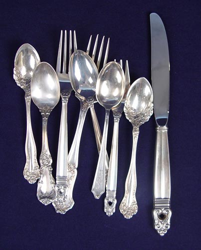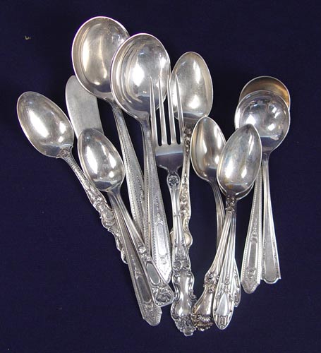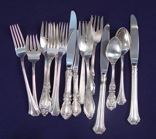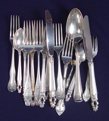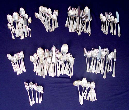 ESTATE LOT OF ASSORTED STERLING FLATWARE: To include approx 150 assorted pieces. 14 Wallace, 51 Towle, 16 Reed & Barton, 9 International, 12 Alvin, 5 Steiff & Kirk, 10 Whiting, 16 Gorham, 17 assorted different or unknown makers. Pieces include flatware, serving spoons, salt spoons, etc. in assorted styles. Most are in like new condition. Many are monogrammed. All counts are approximate. Sold in silver chest, measures 7'' high x 17'' wide x 11 1/4'' deep. Approx. 168.5 troy oz.