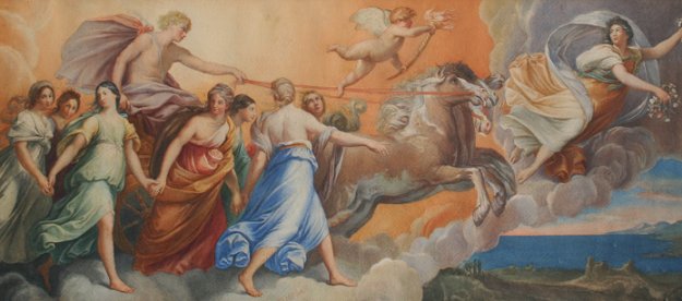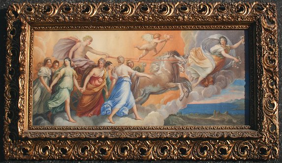 MAKART, Hans, (Austrian, 1840-1884): ''Aura Descending Heaven'', W/C, 12'' x 29'', signed, gilded frame with a small bit of gesso missing, 20'' x 37''.