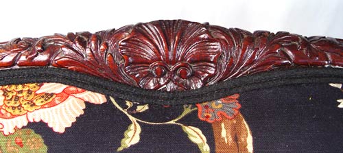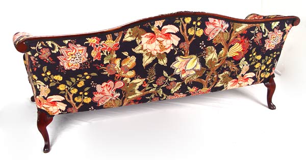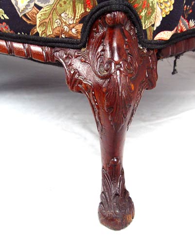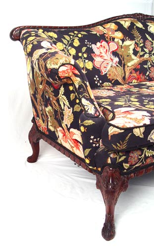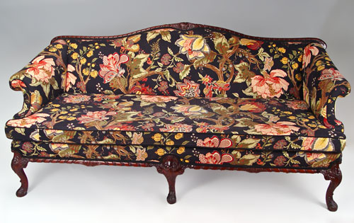 CARVED MAHOGANY CHIPPENDALE STYLE CAMEL BACK SOFA: Carved legs and frame, single cushion. 34 1/2''h. x 79'' x 35''.