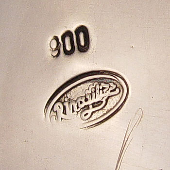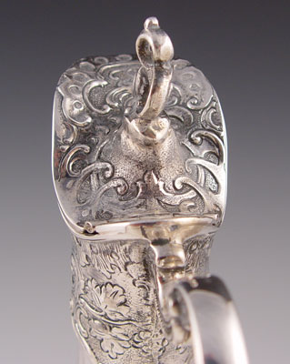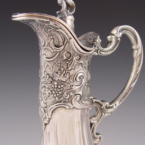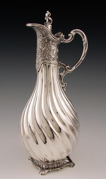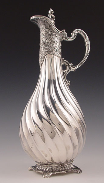 900 SIGNED SILVER CLARET JUG: Swirl ribbed body with embossed floral spout and rocaille handle, based marked .900 rinajrlied?, 13''h. Approx 29.3 troy oz.