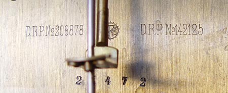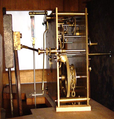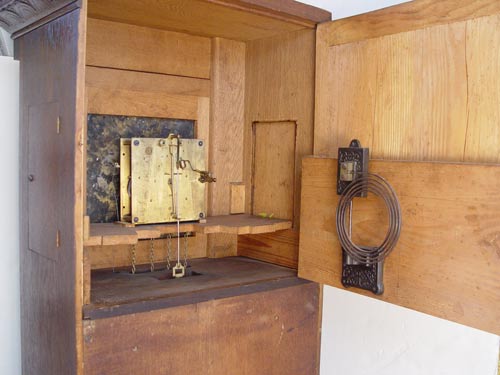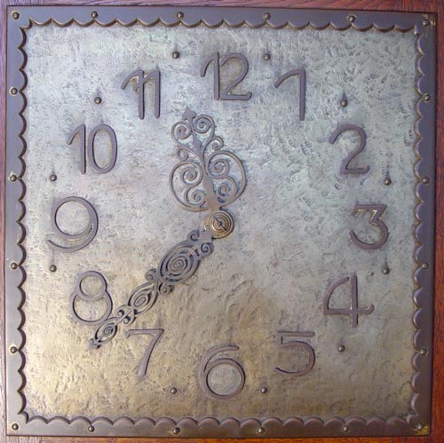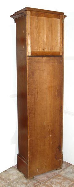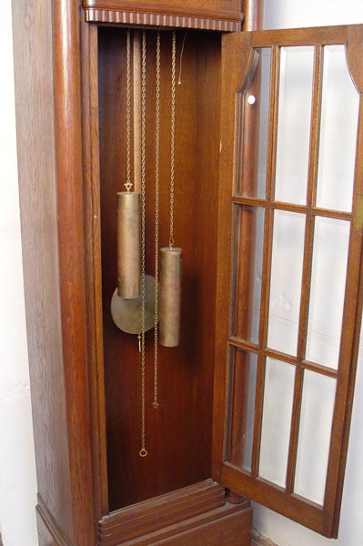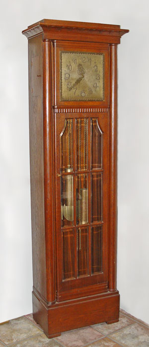GERMAN WERKSTATTE GRANDFATHER CLOCK: Oak tall case with overhanging crest, 9 beveled glass panes on door, columnar stiles. Textured brass dial with ornate hands and brass numerals. Weight driven, brass works. Pendulum and weights included. Approx. 81'' tall x 24'' x 14'' overall.