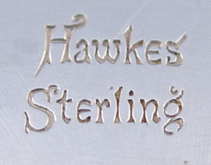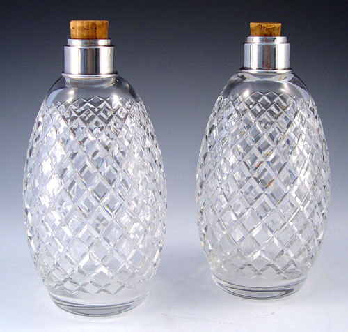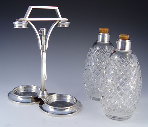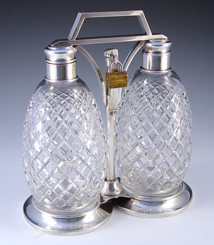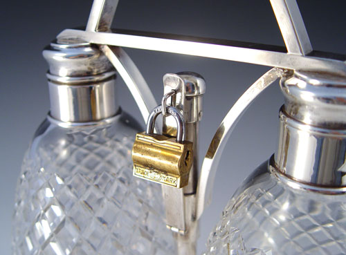 HAWKES STERLING AND CRYSTAL TANTALUS: Two crystal bottles cut in a diamond pattern, the necks are stamped ''Sterling''. The base is stamped ''Hawkes Sterling''. Unlock the padlock to release, lower the bar, and raise the handle to release the bottles. 9 3/4''h. 9'' wide.