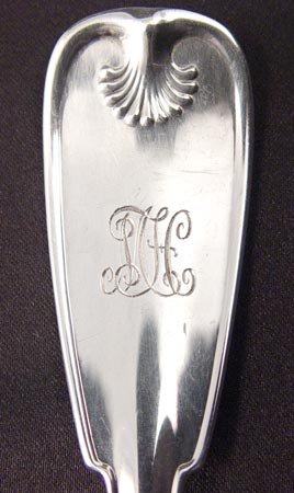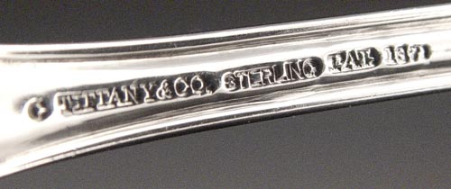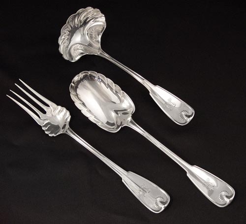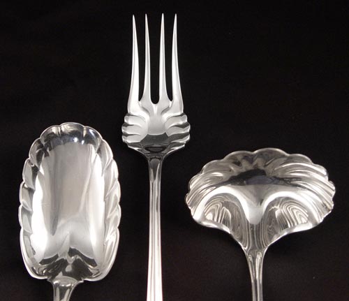 TIFFANY & CO STERLING IN THE PALM PATTERN: 3 serving pieces - gravy ladle with fluted bowl, 7 1/2''. Meat fork, 8 3/4'' long. Serving spoon, 8 1/2'' long. Approx. 7.15 oz. All monogrammed.