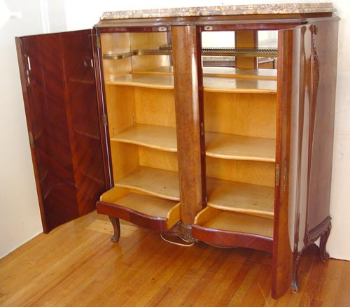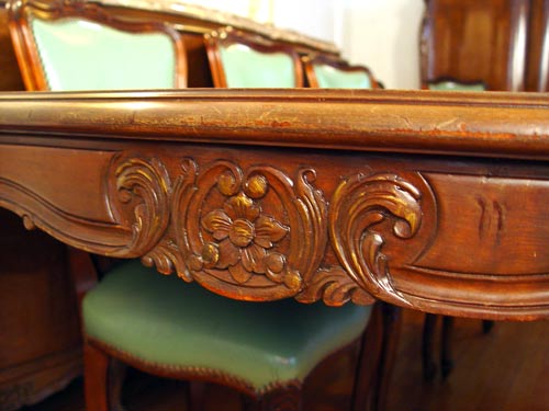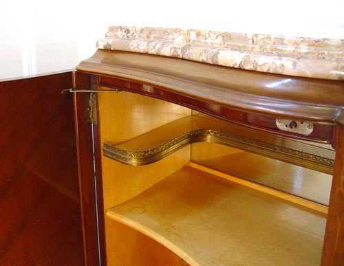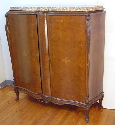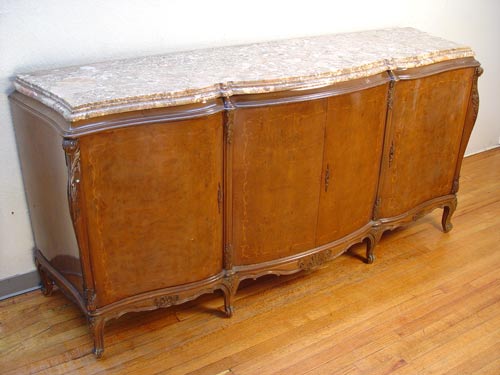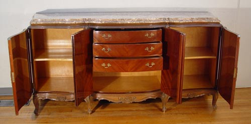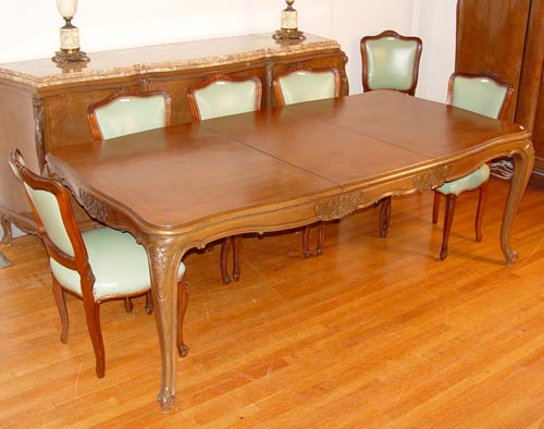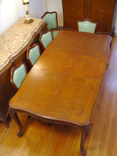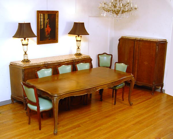 9 PIECE MARBLE TOP FRENCH DINING SET: To include TABLE and 1 LEAF, 29 3/4'' high x 85 3/4'' x 43''. Set of 6 CHAIRS 37 1/2'' high x 20'' wide x 20'' deep. Marble top SIDEBOARD 39 3/4'' high x 84 1/2'' x 23'' deep. Marble top CHINA CABINET 58 1/2'' high x 54 1/2'' wide x 17 1/2'' deep.