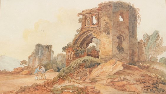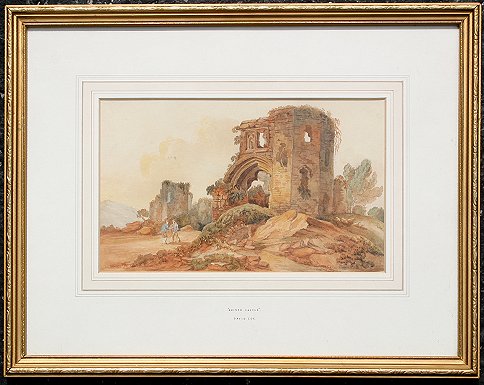COX, David, the younger, (British, 1808-1885): ''Ruined Castle'', Watercolor laid on board, 6 1/2'' x 11'', faint signature lower right, gilded frame, 14 1/2'' x 18 1/2''. Several small spots of foxing.