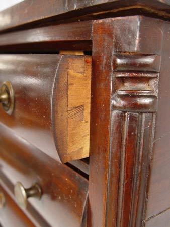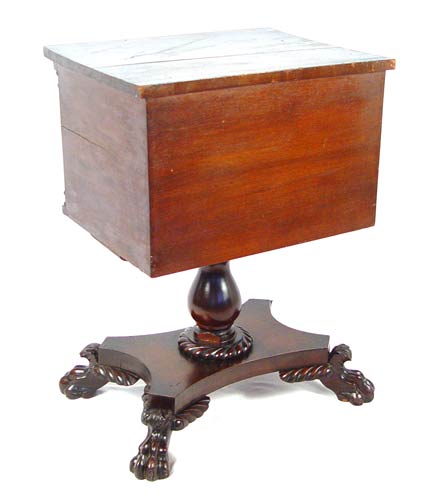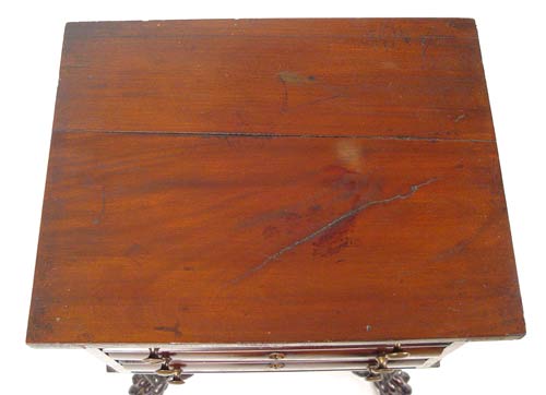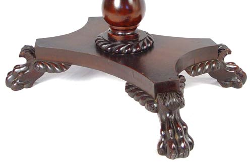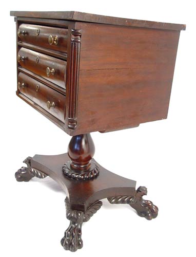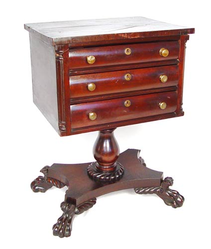 3 DRAWER MAHOGANY STAND: Mid 19th Century stand of graduating drawers. Single pedestal base on platform of 4 hairy paw feet. 30 1/4'' high x 21 1/4'' wide x 16 1/2'' deep. Please note split on top.