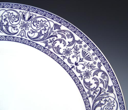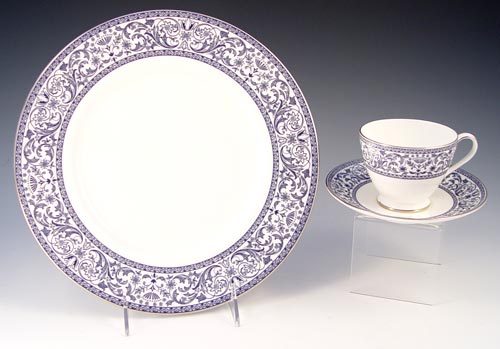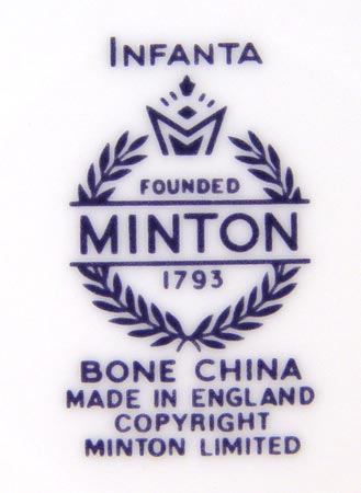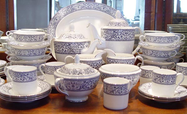 MINTON ''INFANTA'' CHINA SERVICE FOR 12: Dark blue flower and platinum border. 130 pieces to include 12 each of dinner plates, salad plates, bread plates, soup bowls, cream soups and saucers, demitasse cups and saucers, coffee or tea cups and saucers. Service pieces are the gravy and underplate, 2 round covered vegetable bowls, 2 creamers, open sugar, covered sugar, coffee pot, teapot lid, a 13.5'' platter, and handled cake plate.