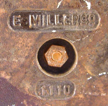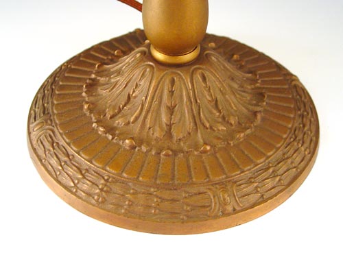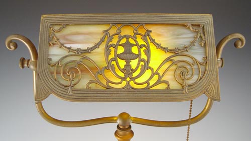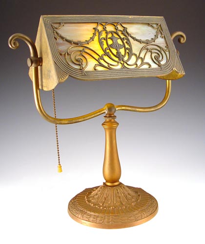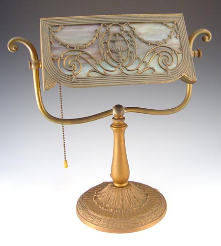 VINTAGE MILLER SLAG GLASS DESK LAMP: Blues and lavender slag glass under metal filigree. The shade angle is adjustable. Original finish on metal base. Single socket, pull chain. Signed E. Miller Co 1110. 14'' tall, 13'' wide.