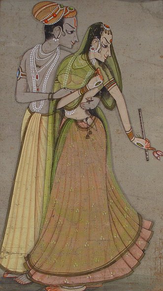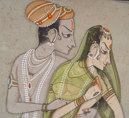 YOUNG INDIAN LOVERS OIL/C: 40'' x 22 3/4'', no visible signature. Scattered abrasions, needs cleaning, some water damage in lower right corner.