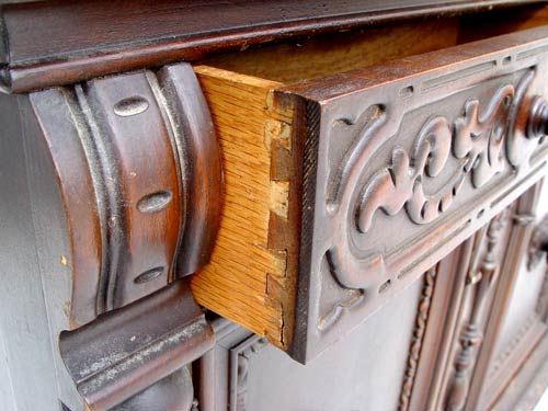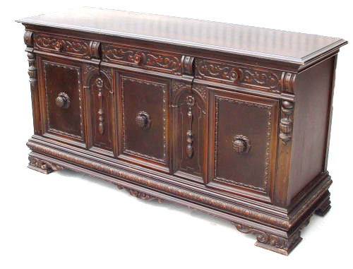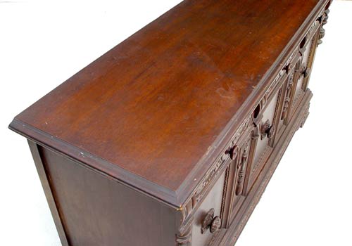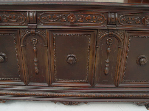 BERKEY AND GAY QUALITY CARVED MAHOGANY CHINA CABINET AND SIDEBOARD: Matched set with relief carved door panels, substantial hatched knobs, applied half columns, carving throughout and along base & feet. China cabinet is 65 1/2'' high x 41 1/2'' wide x 18'' deep. Sideboard measures 36'' high x 68 1/2'' wide x 22'' deep.