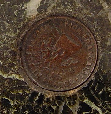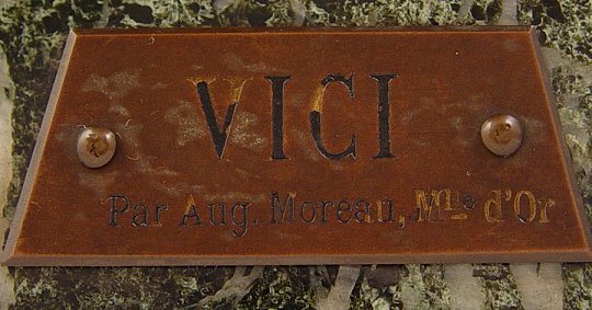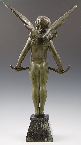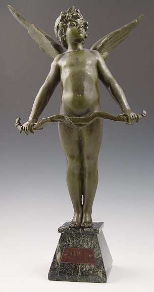 MOREAU, Auguste, (French, 1834-1917): ''Vici'', Patinated Metal Sculpture affixed to a variegated marble plinth, 18'' h., affixed metal plaque reads title, artist, and abbreviation in French for Gold Medal. Some loss to green patina.