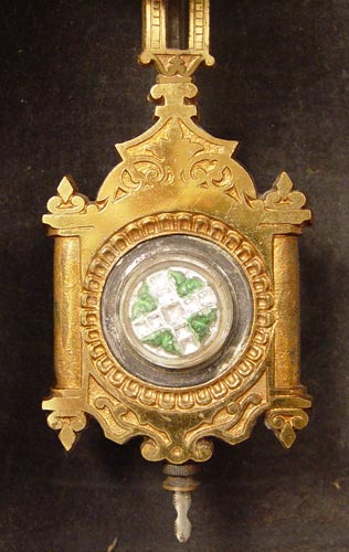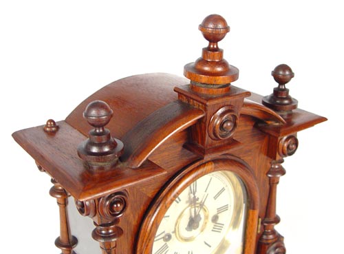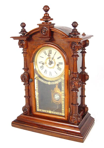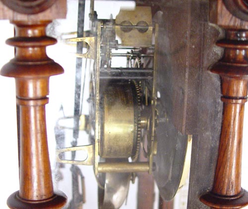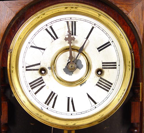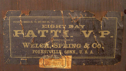 WELCH SPRING & CO PATTI CLOCK: Circa 1880 Patti V.P. by Welch, Spring and Co. with original label on back of wood case. 8 day key and pendulum works. Painted metal face with Roman numerals. Please note some loss of paint on face. Wood case features 3/4 columns and 3 finials. Measures 19'' high x 12 1/4'' wide x 6 1/4'' deep.