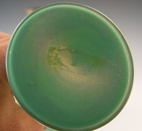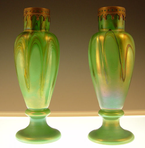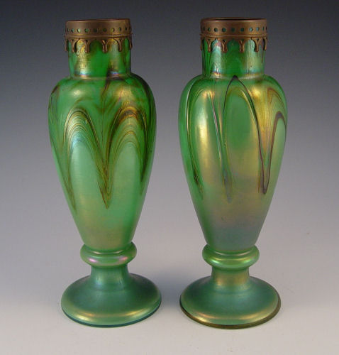 PAIR BOHEMIAN IRIDESCENT ART GLASS VASES: Pulled design on green, pierced metal band on the rim. 9 1/2'' tall.