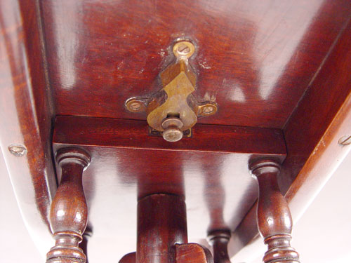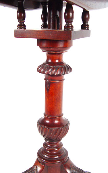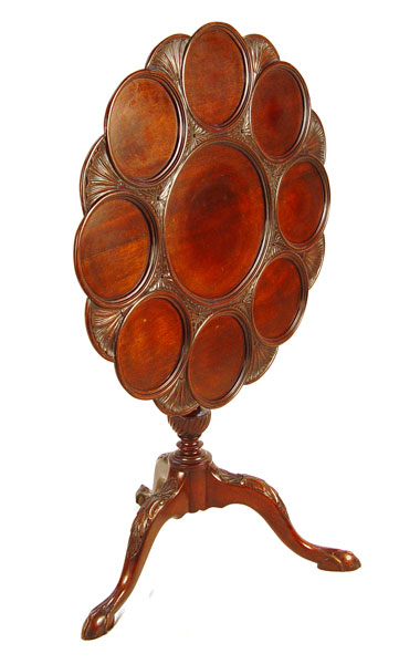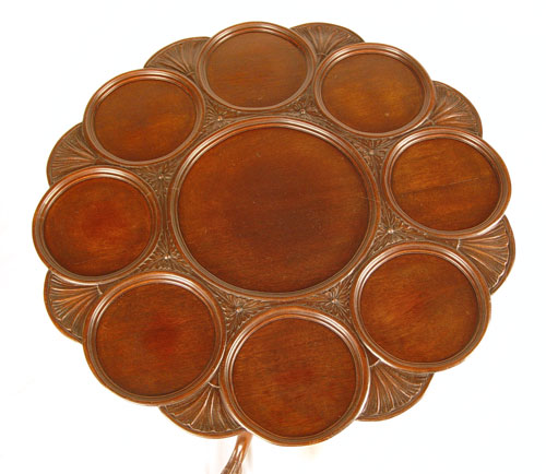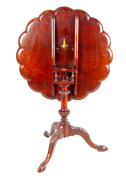CHIPPENDALE STYLE TILT TOP SUPPER TABLE: Tripod supper table with scallop top carved with eight recesses and larger center recess. Bird cage supported top with wedge. Carved baluster stem on cabriole legs ending in claw feet. Approx. 30''h. x 30'' dia.