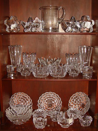29 PIECE ORREFORS CRYSTAL: To include set of 5 bowls (7 1/2'' dia.), 12 candle holders, 7 assorted bowls, 4 vases (6'' - 7 3/4''), and a water pitcher. All pieces signed or foil label. Sold as a lot.