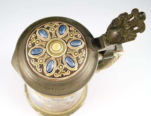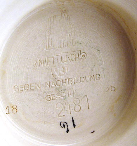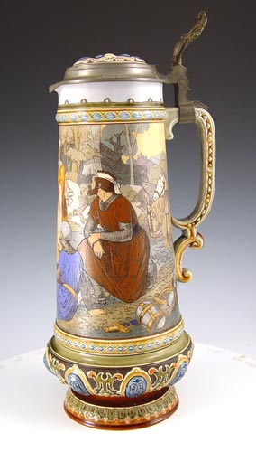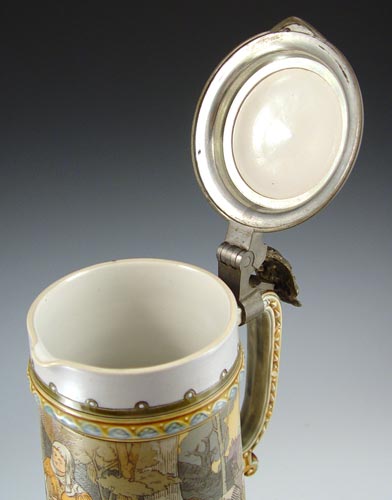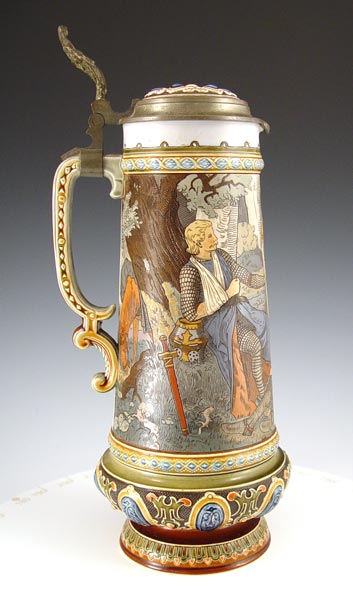 METTLACH STEIN 1.4L 2481: Crusaders receiving aid and comfort. Etched with inlaid lid. No cracks or crazing. Marked on bottom '' METTLACH GECEN NACHBILDUNG GESCHU 18 2481 98''. Measures 14 3/8'' high to top of thumbpress.