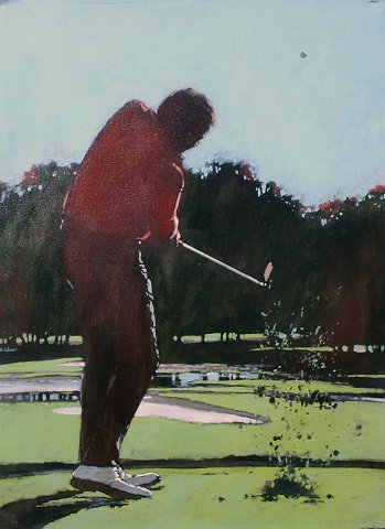 SOLANO, Nathan, (American, 20th C.): Arnold Palmer, Oil/C, 39 3/4'' x 30'', unframed, signed and dated 1985. Some water damage to margin bottom edge of canvas.