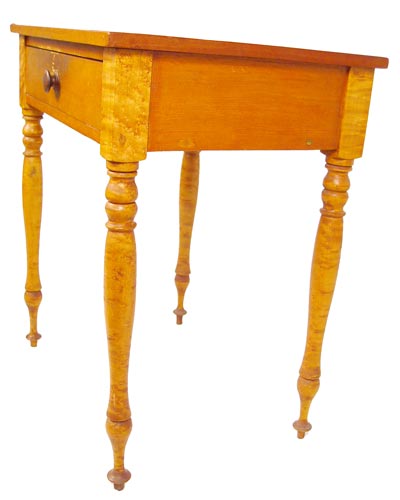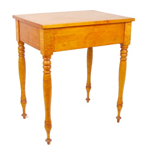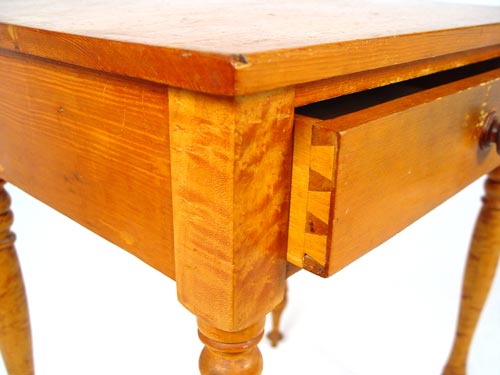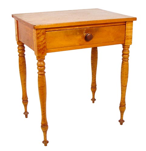 AMERICAN COUNTRY CURLY MAPLE 1 DRAWER STAND: Legs and corner stiles are curly maple, secondary wood is pine. 28'' high x 24'' wide x 18'' deep. Please note nicks around drawer pull.