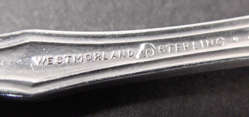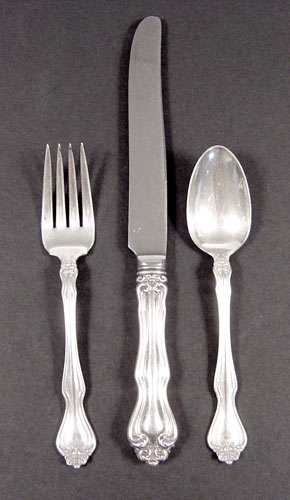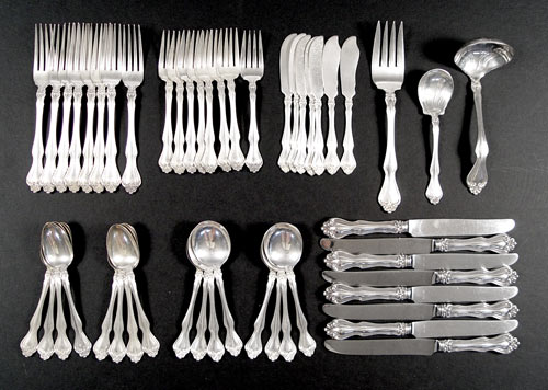 WESTMORLAND GEORGE & MARTHA WASHINGTON STERLING FLATWARE: 50 pieces to include 8 dinner knives (8 3/4''), 8 dinner forks (7 1/8''), 8 salad forks (6''), 8 soup spoons (5 7/8''), 8 teaspoons (6''), 7 butter knives (6''), a gravy ladle (7''), sugar spoon (5 7/8''), and meat fork (8 1/4''). No monograms. Approx. 53.1 troy oz