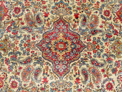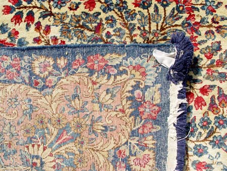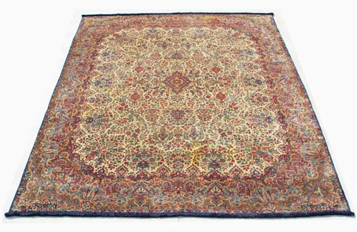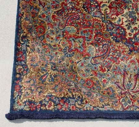 PLUSH PILE SAROUK KIRMAN CARPET: Approx. 14' 5'' x 9' 10''. Deep blue ground with thick fringe. Please note several small patches on the underside.