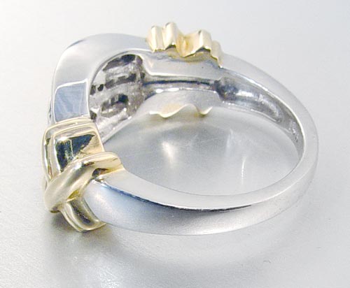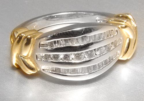 YELLOW AND WHITE GOLD & DIAMOND DINNER RING: 14K yellow and white gold ring with 8 round full cut diamonds and 28 baguette cut diamonds set in three rows. Total Weight is approx. .50 Ct. Rated SI2-I1 in clarity and H-I in color. The diamonds are channel set. Size 7, Weight: 8.7 grams.