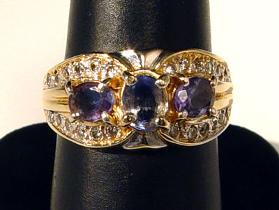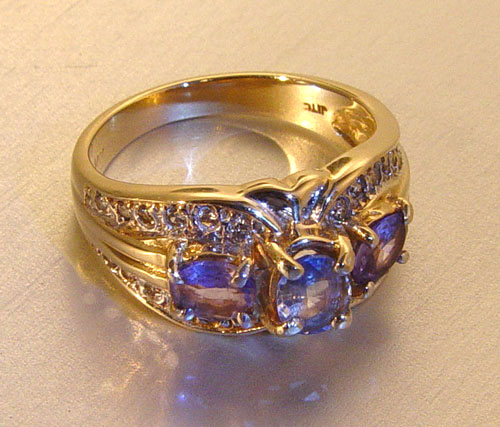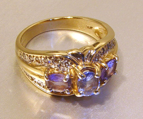 TANZANITE AND DIAMOND RING: 14K yellow gold ring with 3 oval shaped mixed cut tanzanite. Weight: 1.00 CTW approx., rated VVS in clarity (type I), slbV in Hue, 2 in Tone and 2 in Saturation. Set with 24 round full cut diamonds. Total weight .25 Ct. Approx. The diamonds average VS-SI in clarity and H-I in color. The tanzanite and diamonds are prong set. Weight: 7.0 grams. Size 9