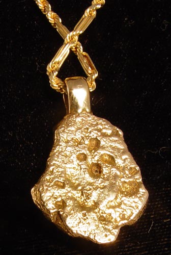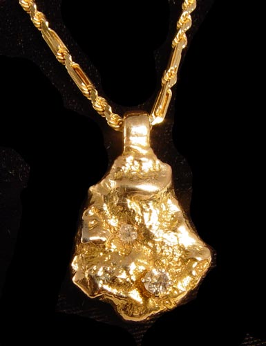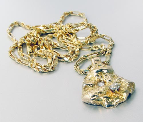 14K AND DIAMOND NUGGET PENDANT ON HEAVY CHAIN: 14K yellow gold nugget pendant with one old European round cut diamond and one round single cut diamond. Total weight approx. .20 Ct. Rated VS in clarity and I-J in color. The diamonds are prong and deep set. Suspended from a 14K yellow gold fancy rope chain, 24''. Nugget is approx. 1'' in length. Weight: 21.7 grams.