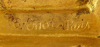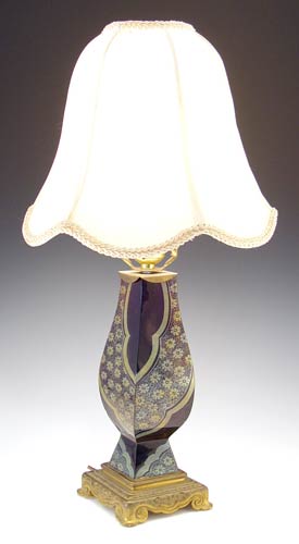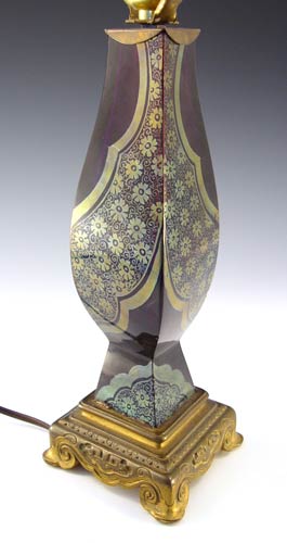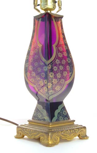 FRENCH ART GLASS TABLE LAMP: Amethyst glass with gold stencil. The metal base is signed E. Enot Paris. The glass is 8 1/2''h., the lamp is 20'' including base and harp.