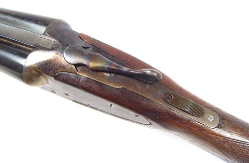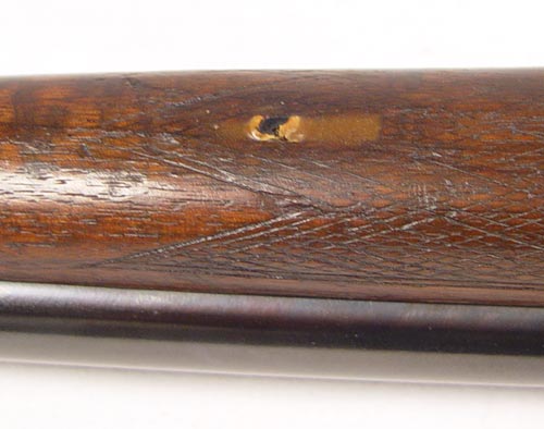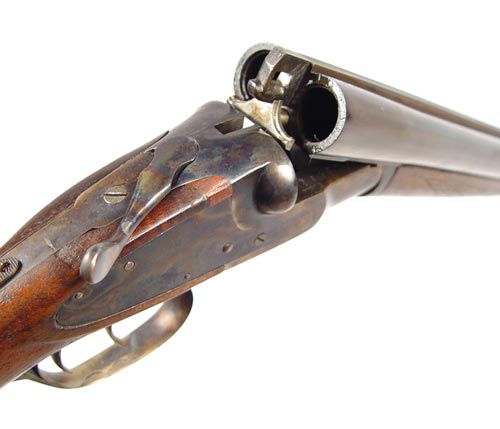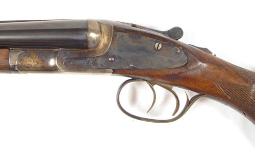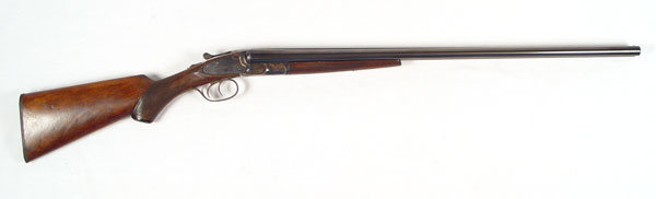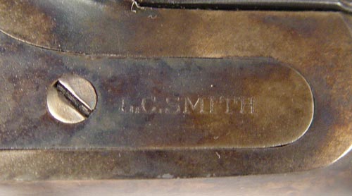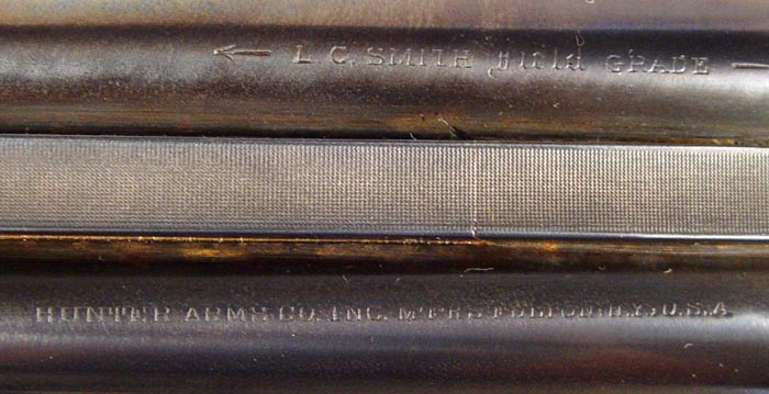 L.C. SMITH HUNTER ARMS DOUBLE BARREL HAMMERLESS SHOTGUN: L.C. Smith Field Grade, Hunter Arms manufactured with partial checkered stock. Some original case color on frame. Hard rubber butt plate. Serial number 88xxx range. 28'' barrel, overall 44 1/2''. Please note small repair to wood.
